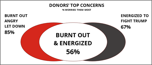We think the results are as useful as they are revealing. From this year’s NPDS emerged a distinct donor contingent that we came to describe as, “Burnt Out and Angry About the Lack of Results but Also Energized to Fight Trump.”