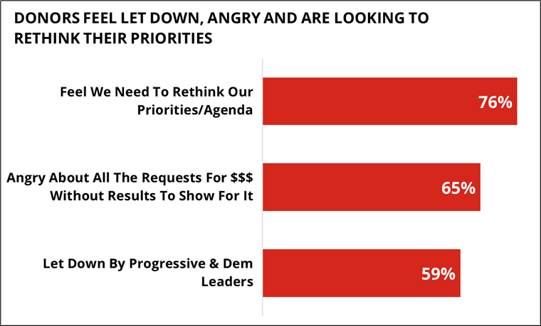 More than three-quarters of donors surveyed indicate they are dissatisfied with the organizational priorities of progressive charities and political candidates. They are angry about a lack of results but remain motivated when shown how their giving directly fuels opposition and change.