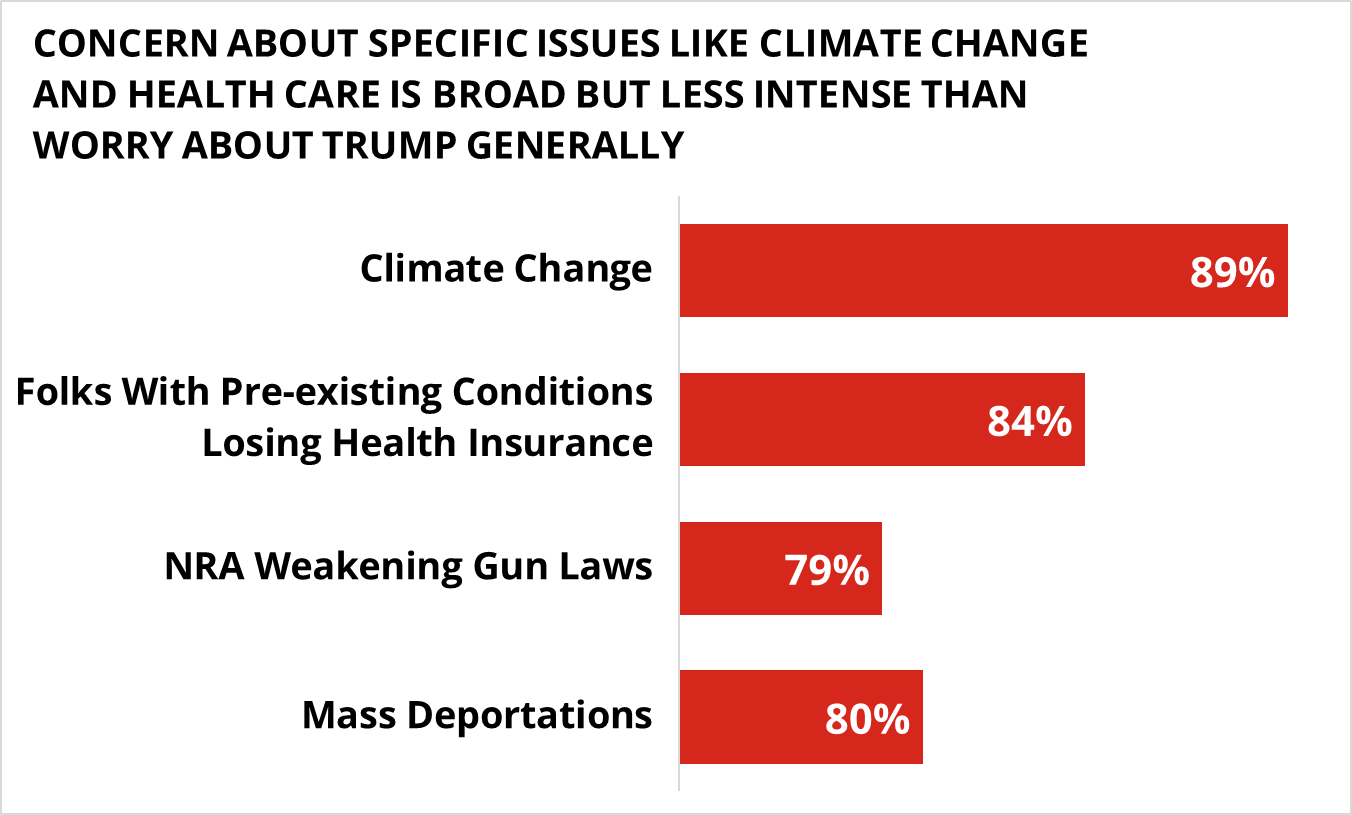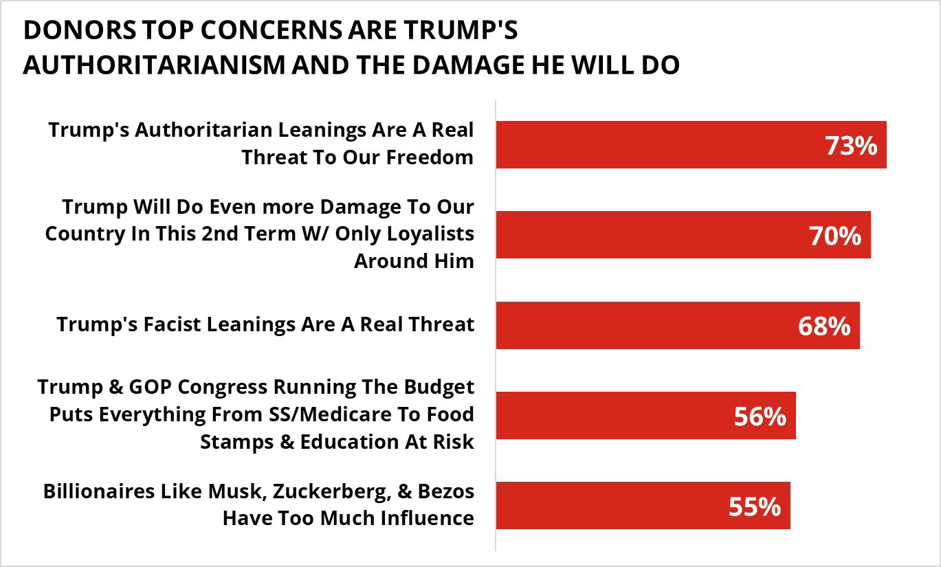Overarching concerns about the Trump administration are the top motivators for progressive grassroots donors. A decisive 73% said they fear Trump’s threat to freedom and 70% worry he’ll do more damage with loyalists in place, 68% agree his fascist leanings are a real threat.