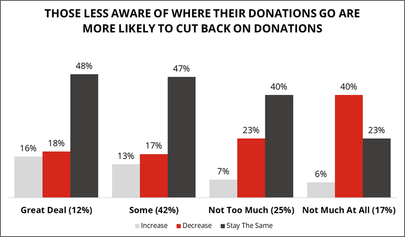 Only 43% plan to increase their giving—a big drop from 67% after Trump was elected the first time. And 40% of political donors say they will give less than before. What we heard repeatedly is donor confidence in transparency has eroded—just shy of 50% feel they know where their money goes, compared to two-thirds four years ago. In the chart below, we see the evidence spelled out for us: